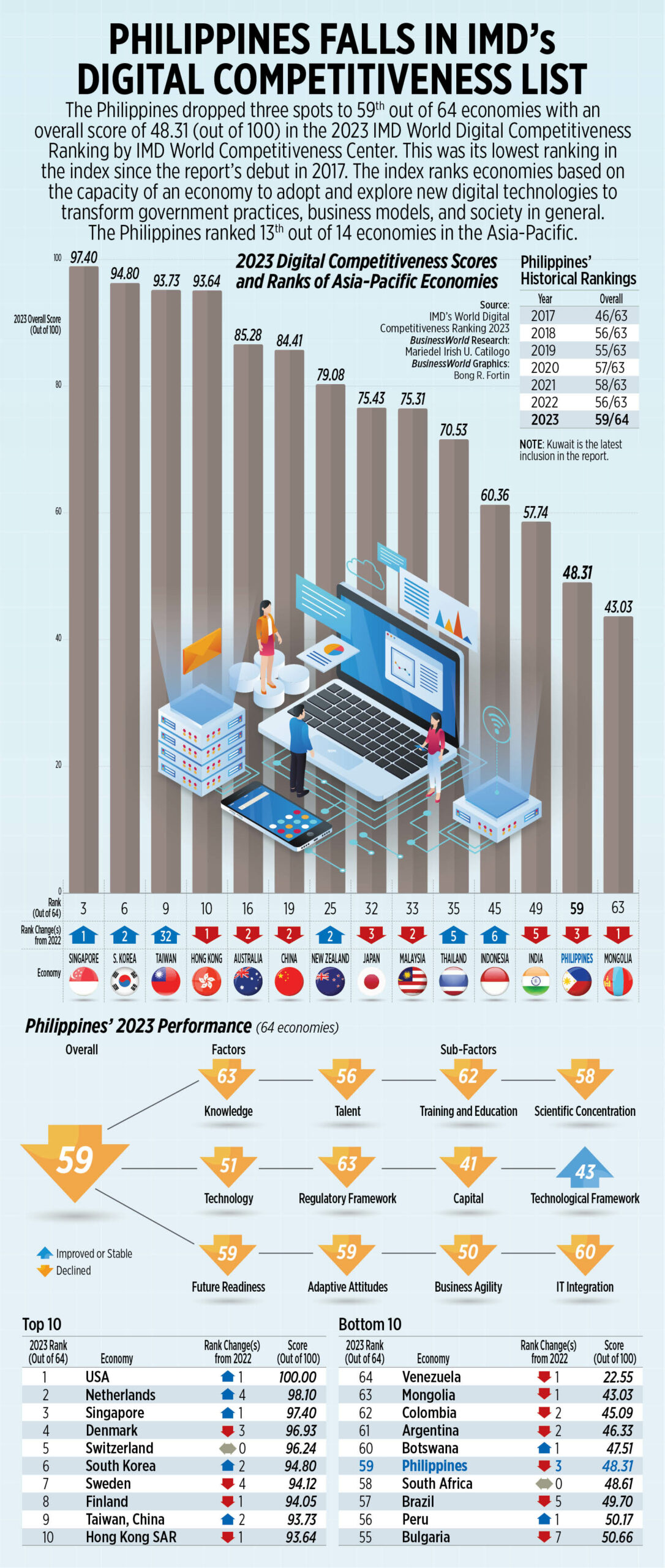 THE PHILIPPINES dropped three spots in the global digital competitiveness index of the World Competitiveness Center of Swiss-based International Institute for Management Development (IMD), finishing at the bottom of its South-east Asian peers. Read the full story.